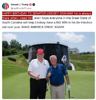 JUST IN - Trump: "HAPPY BIRTHDAY TO SENATOR LINDSEY GRAHAM! He is always there when I need him." https://truthsocial.co...