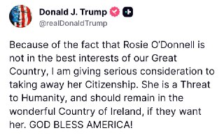 JUST IN - Trump calls Rosie O’Donnell a “Threat to Humanity” and says he is considering taking away her citizenship. ...