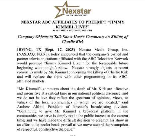 JUST IN - Disney’s ABC takes Jimmy Kimmel off the air "indefinitely" amid a controversy over his recent comments about C...