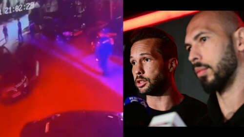 “Rushed and disarmed by my private security. Held until apprehended by the police,” notes Tristan Tate.