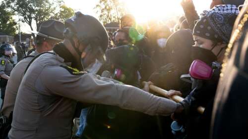 Large crowd of anti-ICE demonstrators now gathered at scene of incident.