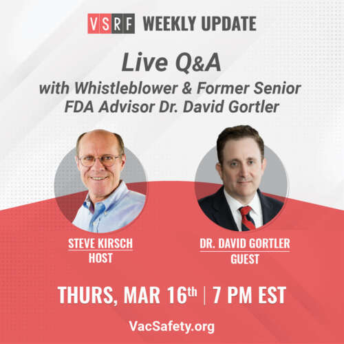 VSRF Weekly UpdateThursday, March 167pm Eastern | 4pm Pacific Register here to watch on ZoomOrLive stream on Rumble I am very excited this Thursday to be speaking with Dr. David Gortler, an FDA insider who has spent the last several years raising the alarm about the relationships between the pharmaceutical companies, the media and the […]
