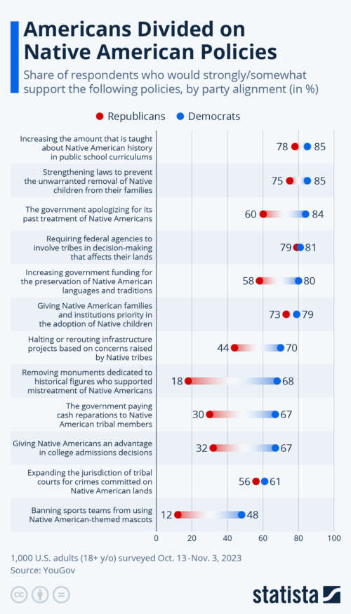 Americans Divided On Native American Policies Americans on both sides of the aisle are in agreement over several policies that would work towards safeguarding the rights of Native American people living in the United States, but they remain divided over a few key areas, among them: reparations, monuments and sports mascots. The following chart, based on […]