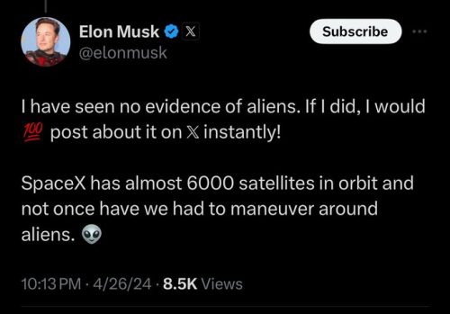 “I get asked a lot about aliens and I usually say I am one” — Elon Musk pic.twitter.com/2mVHOgYedV — DogeDesigner (@cb_doge) April 27, 2024
