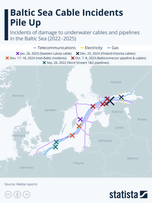 Baltic Sea Cable Incidents Pile Up In the three months between November and January, three incidents of damage to Baltic Sea underwater cables have taken place, severing at least partly seven different telecommunication links that connect Baltic states like Sweden, Finland, Germany, Estonia and Latvia. All in all, Statista’s Katharina Buchholz has counted damage to 10 […]