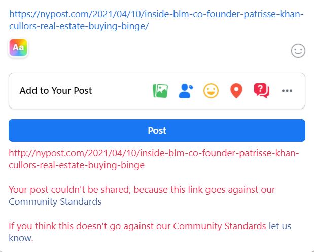 Facebook Censors Link to NY Post Story Exposing BLM Founder’s Home Buying Spree