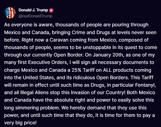 Occidental Dissent - Jan 31st 2025 10:32pm ESTThis is wild. Reuters: “WASHINGTON, Jan 31 (Reuters) – U.S. President Donald Trump said on Friday he would impose hefty new tariffs of 25% on goods from Mexico and Canada and 10% on imports from China, and nothing could be done by the three countries to forestall them. Trump did, however, reference a potential carve out for […]