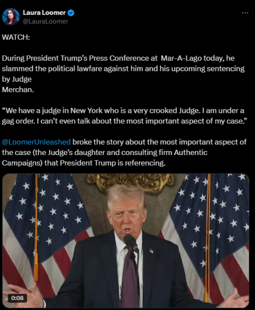 Laura Loomer - Jan 7th 2025 2:19pm EST President Trump held a powerful Tuesday press conference in Mar-a-Lago, laying the groundwork for his upcoming return to Washington, D.C. Trump spoke about the Left’s politicized justice taking place against him, specifically mentioning Judge Merchan, who will be sentencing Trump on January 10th in the Left’s “Hush Money” case against America’s president-elect. Trump spoke about […]