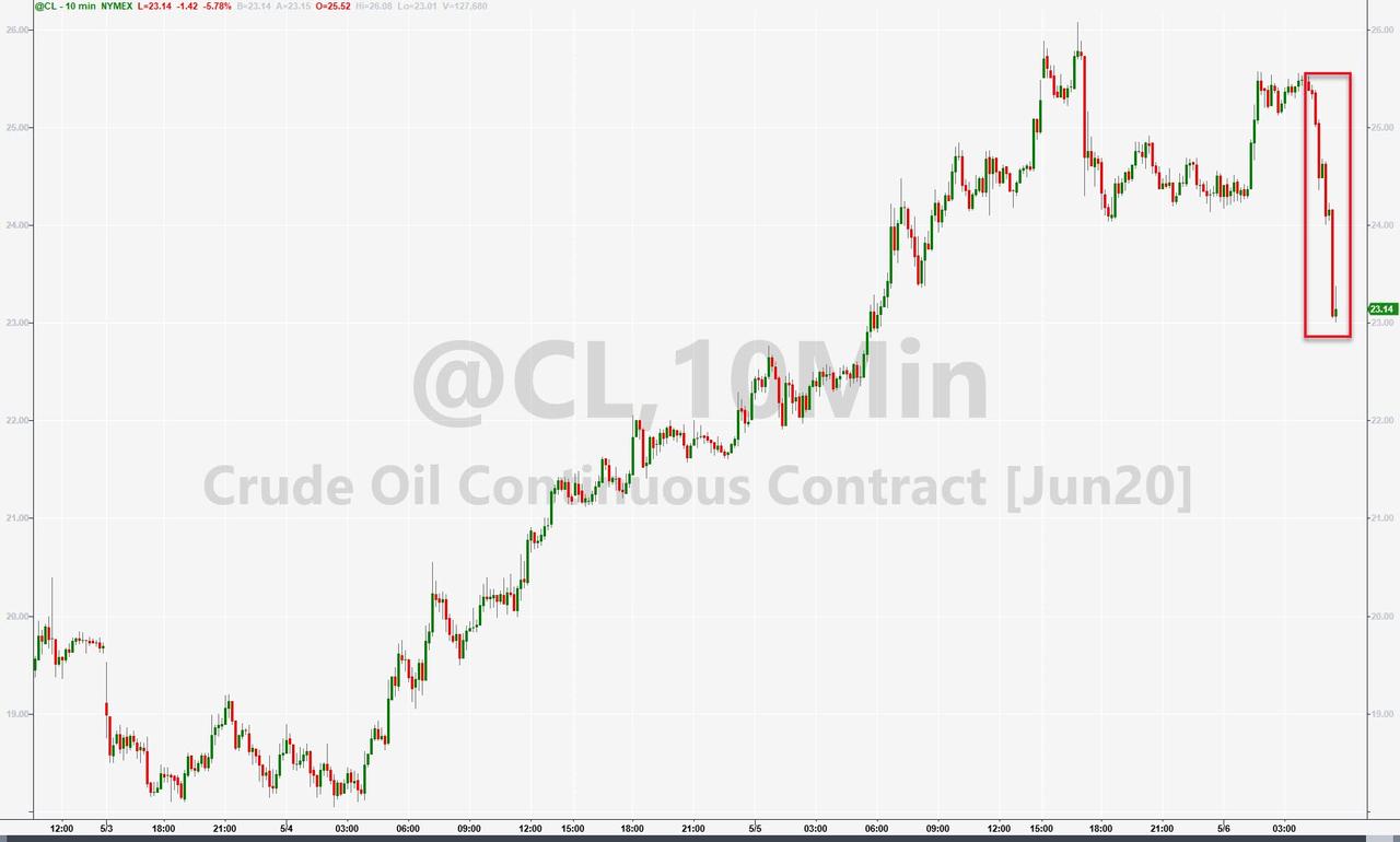 ZeroHedge - May 6th 2020 8:27am EDT Oil Suddenly Crashes After Jobs Report It would appear no one told the machines that ADP would report a devastatingly ugly jobs print this morning… Oil started sliding earlier but the ‘better than expected’ ADP print actually seemed to spark a panic puke for some reason ahead of this morning’s EIA inventory/production report. […]