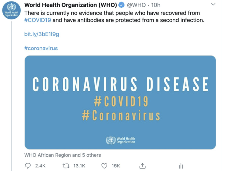 WHO Mysteriously Deletes Tweet About Reinfection As ‘Immunity Passports’ Being Debated