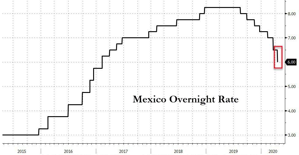 ZeroHedge - Apr 21st 2020 2:14pm EDT Mexico Cuts Rates 50bps In Surprise Move, Warns Of GDP Plunge In a unanimous decision, Banxico’s board surprised the market and lowered the reference rate by 50bps to 6% in the face of a widely-expected recession in the country this year (which it now expects to be a 1H 2020 drop of more than 5% YoY). […]