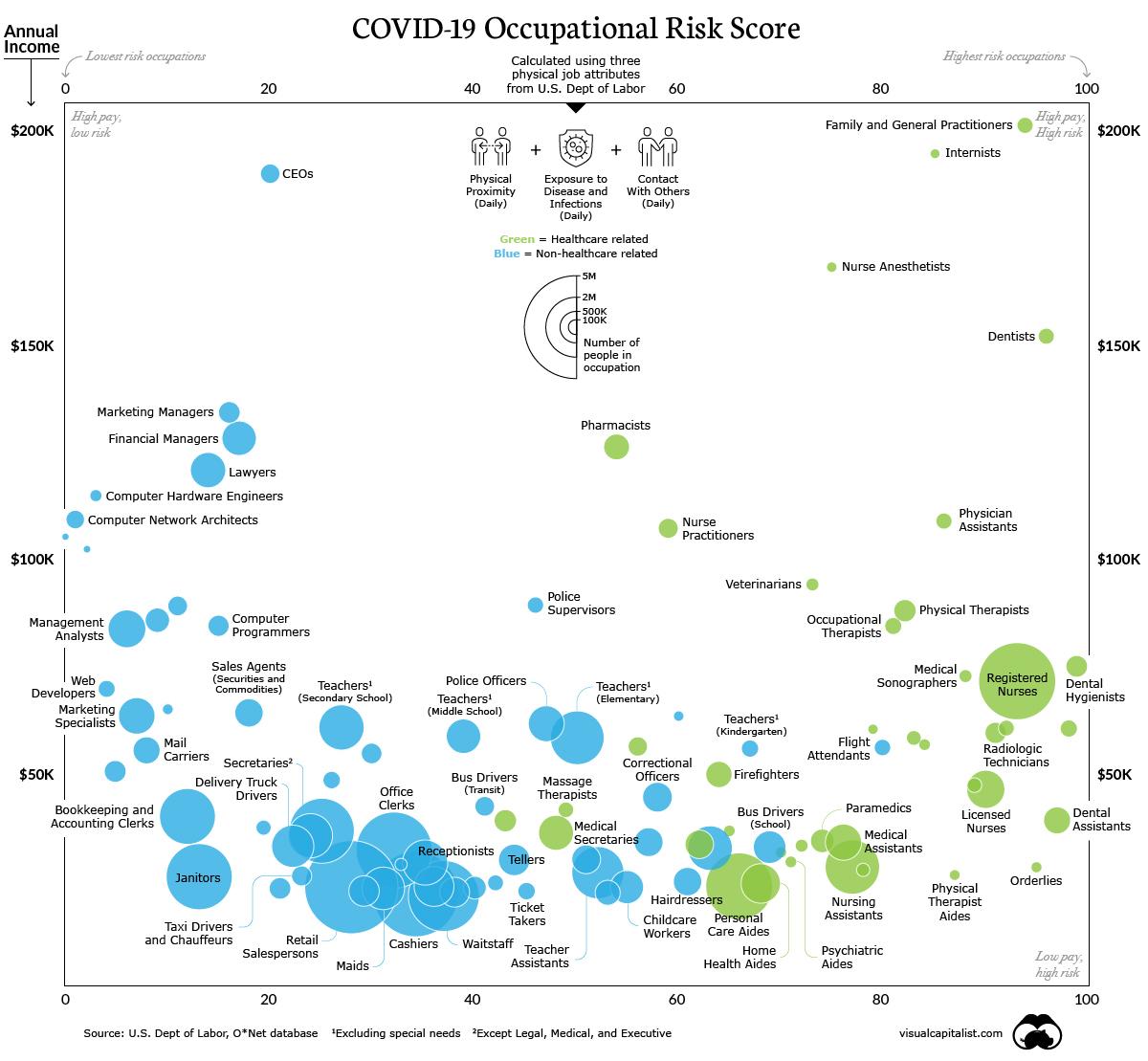 ZeroHedge - Apr 15th 2020 6:40pm EDT These Are The Jobs With The Highest COVID-19 Risk Many individuals have been practicing social distancing by working from home in recent weeks. While this arrangement can be a great way to reduce one’s exposure to COVID-19, it’s a luxury that’s available to just 29% of Americans. And, as Visual Captalist’s Marcus Lu notes, the situation for […]