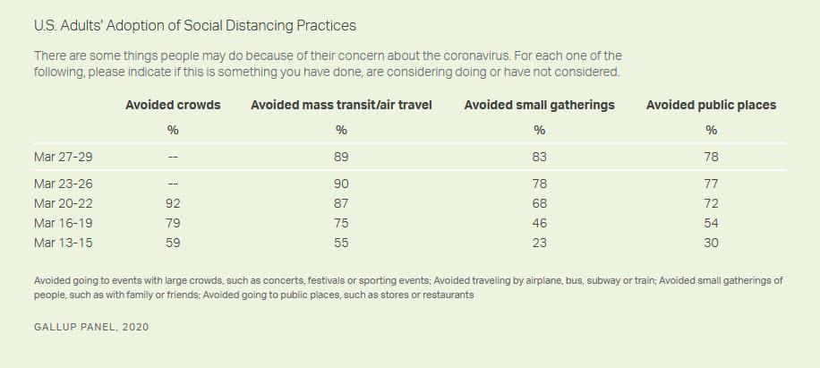 ZeroHedge - Apr 1st 2020 1:15pm EDT How Americans Are Responding To The Coronacrisis: A Gallup Poll Gallup has been polling Americans on the COVID-19 crisis daily since March 13. Here are new results from Gallup’s interviewing through March 29, as well as highlights from the past two weeks. Social Distancing Still on the Increase Gallup last reported Americans’ adherence to the […]