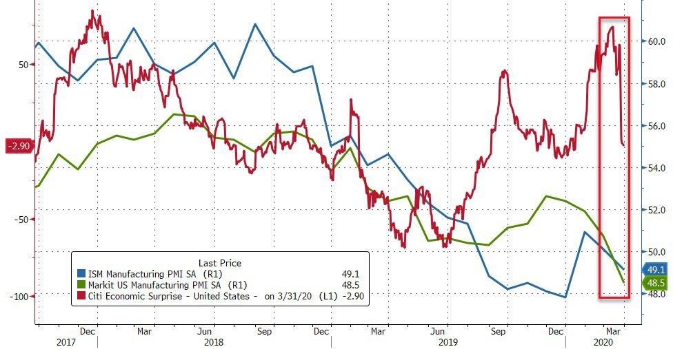 ZeroHedge - Apr 1st 2020 10:05am EDT US Manufacturing Slumps To Biggest Contraction Since Financial Crisis After a bloodbath in European PMIs (and a ‘surprise’ surge back to growth in China), and following some serious collapses in regional Fed surveys (and this morning’s tumble in Canadian PMIs), today’s US manufacturing survey data was expected to slide further into contraction (though not as […]