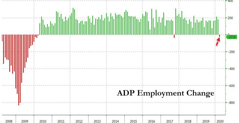 ZeroHedge - Apr 1st 2020 8:18am EDT Small Businesses Lost Most Jobs Since Financial Crisis, ADP Reports Despite last week’s mind-numbing explosion in initial jobless claims, expectations were for a rather modest 150k drop in ADP employment in March… and in a shocking turn of events – ADP employment dropped a mere 27k jobs!?? Source: Bloomberg Both Goods and Services firms saw […]