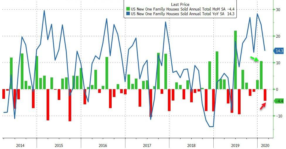 ZeroHedge - Mar 24th 2020 10:09am EDT New Home Sales Tumble In March, Despite Plunging Mortgage Rates It seems the collapse in the stock market and overall global sentiment in the last few weeks has overwhelmed any ‘value’ seen from leveraging lower mortgage rates. New Home Sales plunged 4.4% MoM (from an upwardly-revised 10.5% MoM surge in February) Source: Bloomberg Based on […]