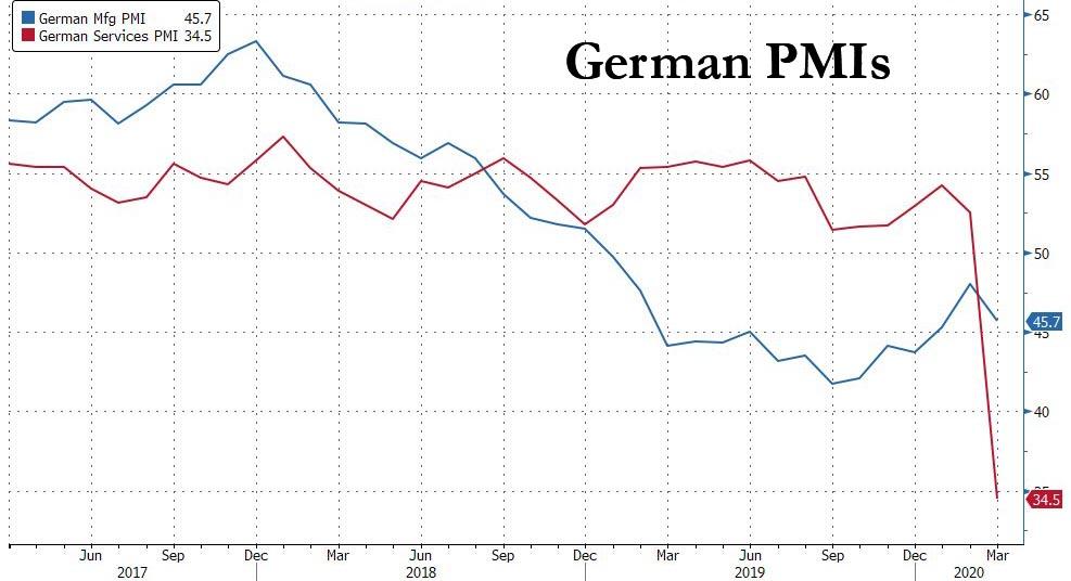 ZeroHedge - Mar 24th 2020 7:41am EDT “European PMIs are… Well, There Is No Word For That!” Submitted by Christopher Dembik of Saxo Bank Speechless. March statistics are very ugly everywhere in Europe. German Flash manufacturing PMI is out at 45.7 and services PMI is falling at 34.5 (yes, 34.5!!!). The below chart is the first of many others that will look […]