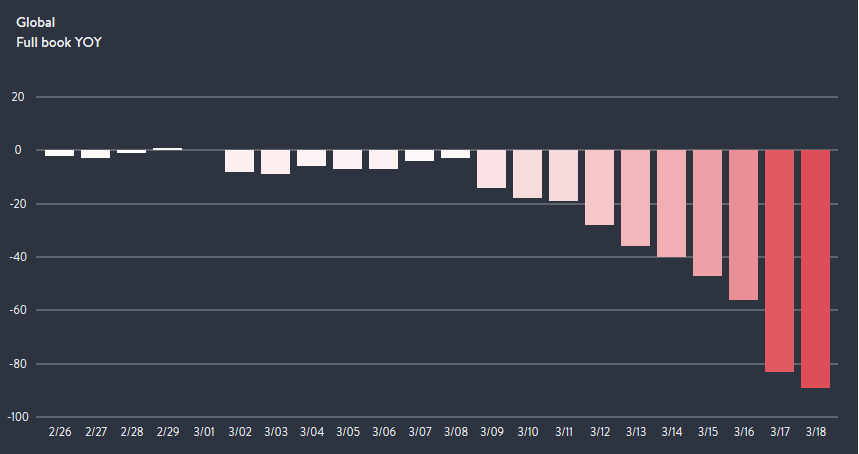 ZeroHedge - Mar 20th 2020 2:25pm EDT New OpenTable Data Shows Devastating Collapse In Restaurant Traffic According to new data from OpenTable, the COVID-19 pandemic has led to an absolute plummet in restaurant traffic, as as nearly 60,000 restaurants which use the website to offer bookings have faced “unprecedented challenges.” Based on their latest information, the median state is down 95%. What’s […]