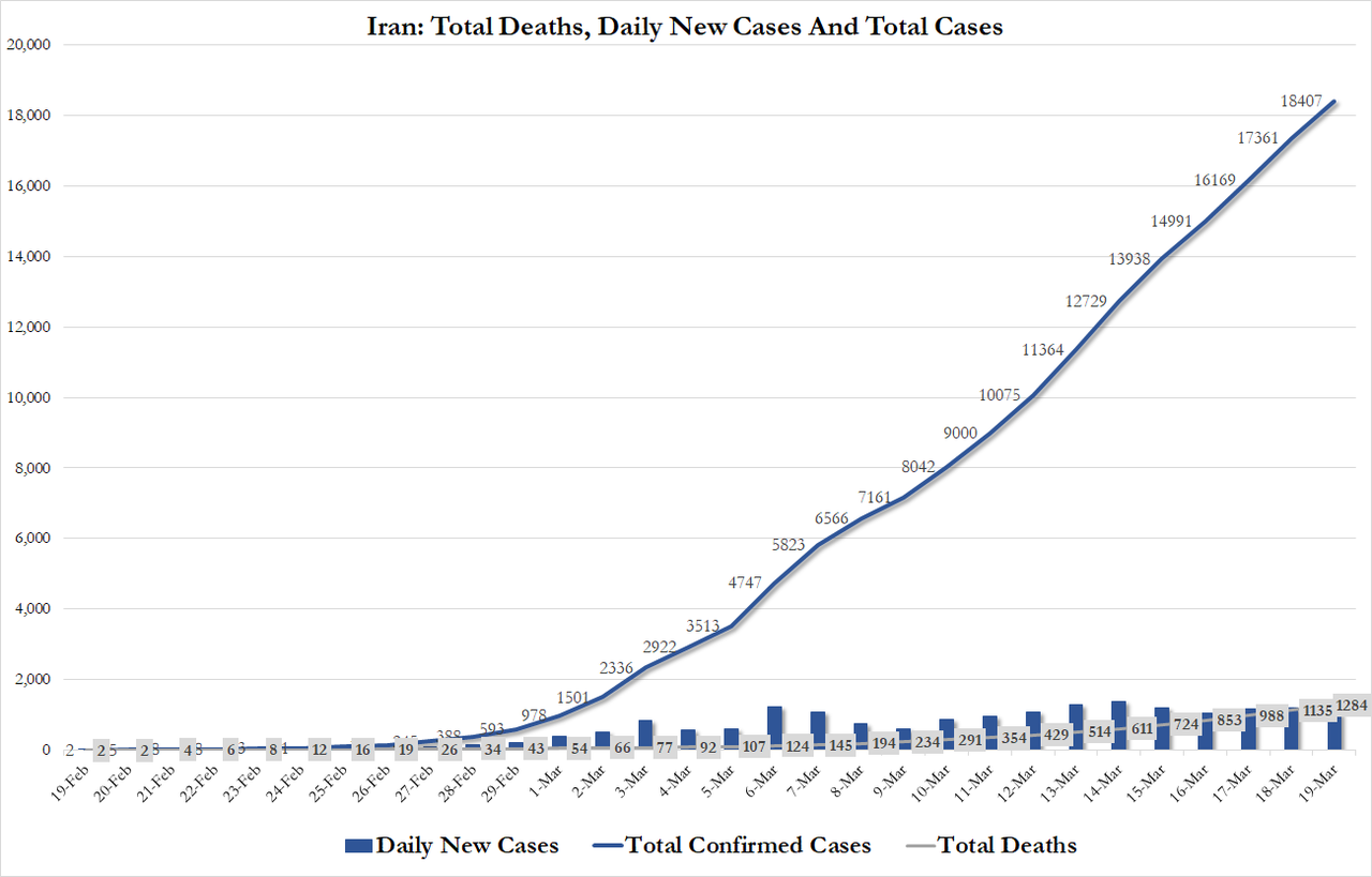 ZeroHedge - Mar 20th 2020 1:00am EDT 50 New Infections Every Hour In Iran, One Death Per 10 Minutes: Health Ministry Despite that between Tuesday and Wednesday of this week Iran witnessed its biggest ever single-day spike in Covid-19 cases, authorities are still struggling to get everyone to observe quarantine and self-isolation measures, especially after throngs of hardline Shia demonstrators have gathered to protest the closure of […]