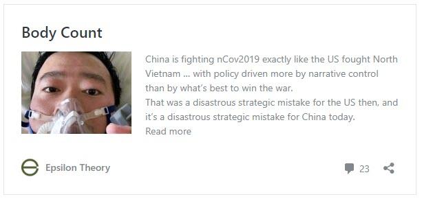 ZeroHedge - Feb 25th 2020 12:30pm EST The Fall Of Wuhan (Lessons For America) Authored by Ben Hunt via EpsilonTheory.com, Two weeks ago I wrote about the corrupt political response of China to COVID-19. Last week I wrote about the corrupt political response of the World Health Organization to COVID-19. This week I’m writing about the corrupt political response of the United […]
