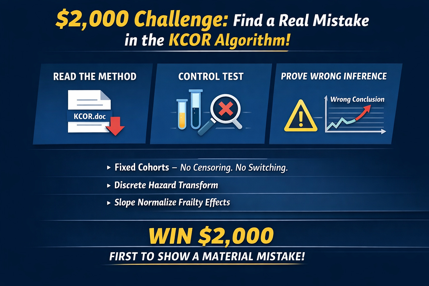 Steven Kirsch - Dec 18th 2025 2:57pm EST Executive summary I’m offering $2,000 to the first person (by chronological order of replies to the pinned comment) who both: identifies a material methodological flaw in KCOR v5.4 (Kirsch Cumulative Outcomes Ratio) when applied to retrospective observational record-level mortality data, specifically the Czech Republic dataset, and identifies a more reliable approach to analyzing the same […]