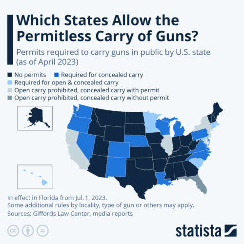ZeroHedge - Apr 12th 2023 10:00pm EDT Which States Allow The Permitless Carry Of Guns? In July, Florida will become the 26th state in the U.S. that isn’t requiring a permit to carry a concealed gun in public. As Statista’s Katharina Buchholz reports, Governor Ron DeSantis signed legislation last week finalizing the change. In recent years, more and more states have enacted similar […]
