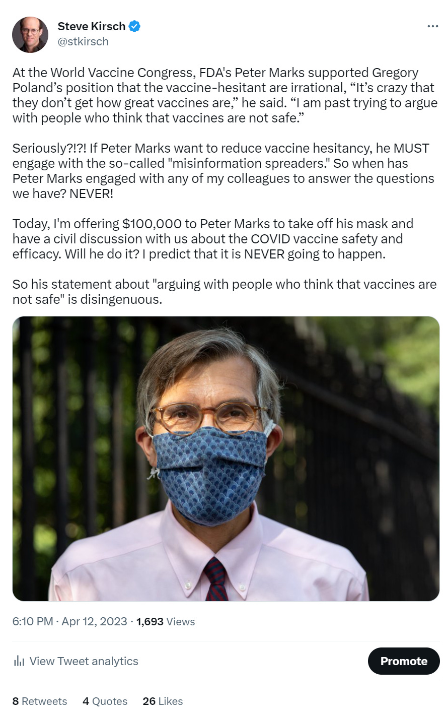 Steven Kirsch - Apr 12th 2023 9:37pm EDT The last time I offered someone $100K to remove their mask, I captured worldwide attention (over 32M views on my tweet) and was called a “creep” by the media. I just did it again with Peter Marks just now: Here’s the full story on the World Vaccine Conference where he spoke. Take action Please click […]