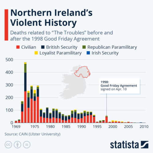 ZeroHedge - Apr 10th 2023 3:35am EDT Northern Ireland’s Violent History U.S. President Biden is due to visit Northern Ireland and the the Republic of Ireland this week, marking the 25th anniversary of the Good Friday Agreement – generally acknowledged to have ended the conflict known as ‘The Troubles’, though instances of sporadic violence have occurred since. As Statista’s Martin Armstrong reports, the conflict […]