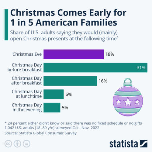 ZeroHedge - Dec 23rd 2022 10:40pm EST Christmas Comes Early For 1 In 5 American Families Christmas traditions vary greatly across the world. As Statista’s Felix Richter notes, while some countries hold the main celebration on Christmas Eve, others wait until Christmas Day to get festive and, most importantly at least to kids, to open presents. In the United States, most families unwrap […]