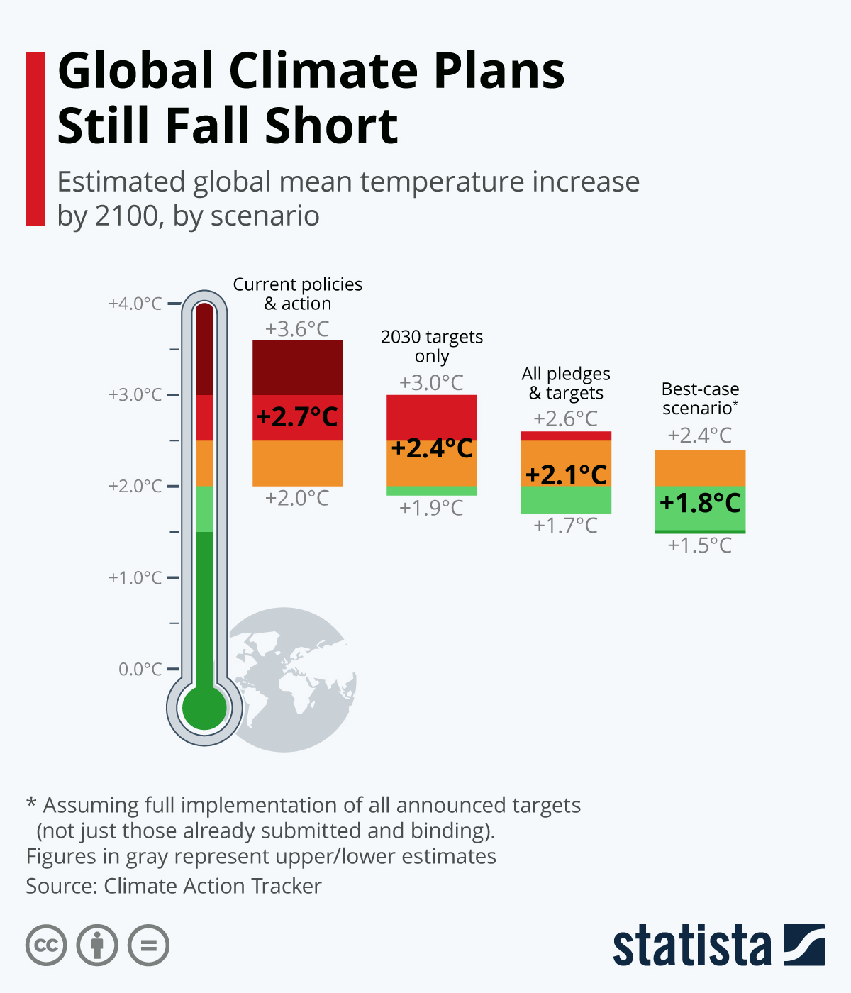 ZeroHedge - Nov 12th 2021 4:15am EST COP-Out? Global Climate Plans Fall Short Greta’s gonna be really mad… Despite many national governments apparently recognising the urgency of the climate situation at the COP26 summit, Statista’s Martin Armstrong points out that new estimates from Climate Action Tracker suggest that the 2030 pledges made will still result in a global mean temperature increase of 2.4°C […]