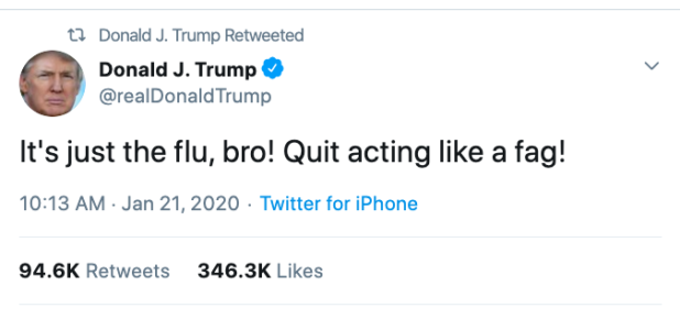 Daily Stormer - Mar 22nd 2020 6:33am EDT Andrew Anglin Daily Stormer March 22, 2020 CHINESE VIRUS FACT CHECK pic.twitter.com/qJugCylvE2 — Donald J. Trump (@realDonaldTrump) March 22, 2020 President Trump has done a massive flip-flop on the Coronavirus, and it isn’t really being talked about. He started out basically saying that it was just a flu, bro, and everyone needed to chill. Now […]