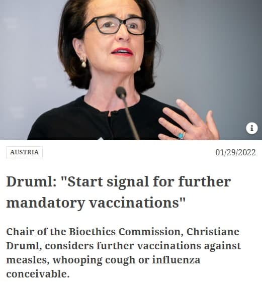 Paul Joseph Watson - Jan 31st 2022 7:20am EST A prominent bioethicist has suggested that health authorities should consider expanding vaccine mandates to cover illnesses other than COVID-19 such as measles and influenza. The comments were made by Christiane Druml, lawyer and chair of the Austrian federal Bioethics Commission. During an interview, Druml asserted, “The Covid-19 vaccination requirement could be the starting signal for […]