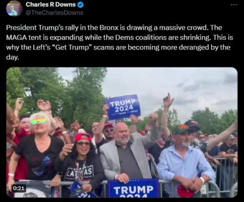 Laura Loomer - May 23rd 2024 9:17pm EDT President Trump proved Thursday that MAGA’s tent is rapidly expanding as local authorities estimate that over 31k people attended President Trump’s rally in the Bronx. Trump gave a passionate speech about the power of hard work and coming together to ensure November’s vote is “too big to rig.” Trump also spoke on the Democrat’s failures […]