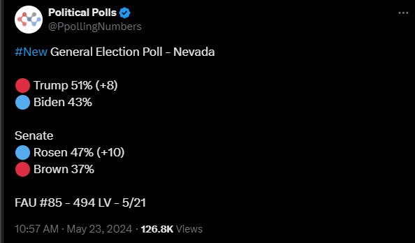 Laura Loomer - May 24th 2024 4:42pm EDT New polling from the critical state of Nevada shows that GOP Senate candidate Sam Brown is trailing his Democrat opponent, Jacky Rosen, by 10 points, while the same poll shows that President Trump is beating Biden in the state by 8 points. It should be no shock that 18 points separate Brown and Trump despite […]