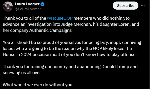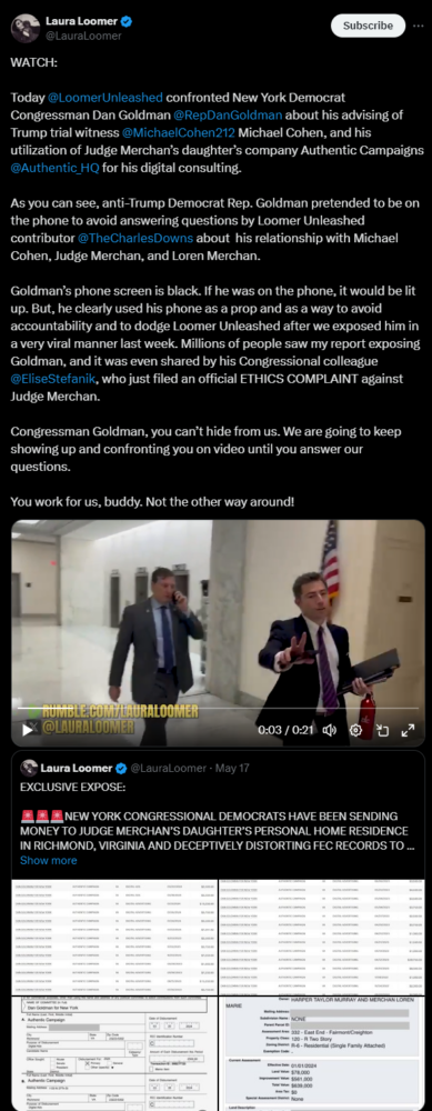 Laura Loomer - May 29th 2024 5:14pm EDT The House GOP missed a golden opportunity to subpoena Judge Merchan’s daughter, Loren, over her firm, Authentic Campaigns, which received millions in payments from Joe Biden, Hakeem Jeffries, and other top Democrats. Laura Loomer was the first to report this. Authentic Campaigns offers digital services. During Trump’s trial, Authentic Campaigns client, New Jersey Rep Mikie […]