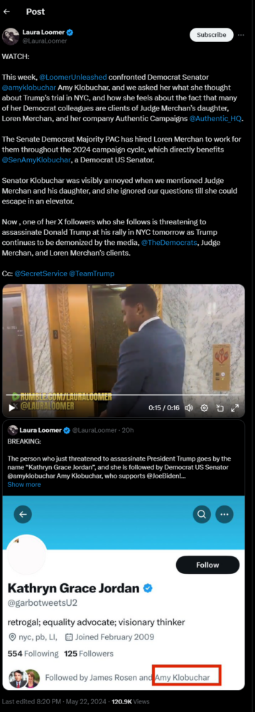Laura Loomer - May 23rd 2024 4:38pm EDT Minnesota Senator Amy Klobuchar, who faces reelection in November, claims to be a “moderate” Democrat in the United States Senate. However, Klobuchar’s behavior this past week conveys a different reality. Klobuchar ran into the elevator Tuesday when Loomer Unleashed asked if she would comment on President Trump’s Trial and her U.S. Senate colleagues’ decision to […]