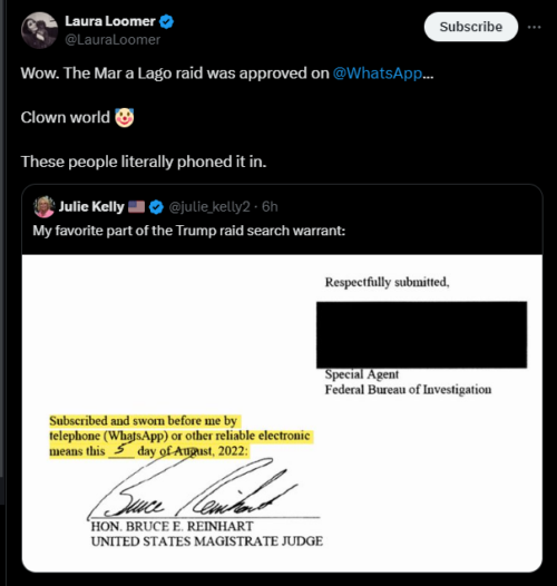 Laura Loomer - May 24th 2024 3:28pm EDT Elite Democrats and their donors are doing whatever it takes to “take out Trump.” New court filings from Biden’s DOJ raid on Mar a Lago show that the DOJ used Mark Zuckerberg’s WhatsApp to communicate and approve the warrant used to execute the raid on Trump’s Mar a Lago home. This means that Mark Zuckerberg […]