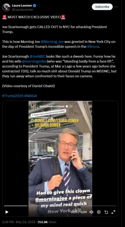 Laura Loomer - May 24th 2024 6:16pm EDT An exclusive video obtained by Loomer Unleashed shows MSNBC’s Joe Scarborough being called out in New York City for his attacks against President Trump. Scarborough was uninterested in responding to criticism and faked a phone call during the exchange. Scarborough has routinely criticized President Trump and MAGA, but when it comes time to answer for […]