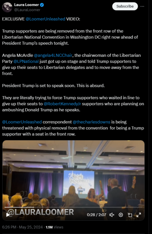 Laura Loomer - May 28th 2024 3:44pm EDT President Trump’s Saturday speech to the Libertarian Convention in D.C. was a historic political event that all in attendance will never experience again. Supporters of President Trump and Libertarians open to Trump befriended each other as they waited in line and eventually took their seats to see the President. This angered RFK JR and the […]
