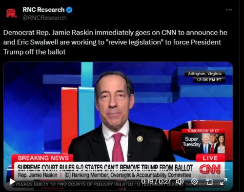 Laura Loomer - Mar 4th 2024 4:49pm EST J6 Committee Member Jamie Raskin appeared on CNN right after the United States Supreme Court unanimously ruled Monday that President Trump can remain on the ballot. During his CNN appearance, Raskin stated that in the wake of SCOTUS’ ruling, he and Eric Swalwell would introduce legislation in Congress to kick Trump off the ballot. Raskin’s […]