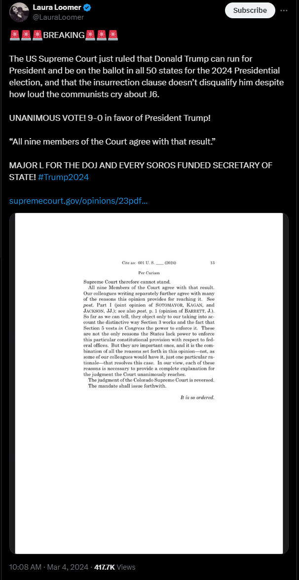 Occidental Dissent - Mar 4th 2024 4:56pm ESTBREAKING: States may not unilaterally disqualify Donald Trump from the ballot, the Supreme Court rules unanimously.. Only Congress can decide. pic.twitter.com/frmq3pXN0t — InteractivePolls (@IAPolls2022) March 4, 2024 TRUMP: “I want to start by thanking the Supreme Court for its unanimous decision today. It was a very important decision, very well crafted. I think it will […]