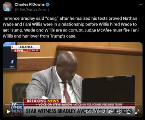 Laura Loomer - Feb 27th 2024 5:51pm EST Another week leads to more victories for President Trump in the courtroom. Trump scored another massive win in Fulton County, Georgia, on Tuesday as Terrence Bradley, the divorce attorney for Fani Wills’ lover Nathan Wade, again took the stand in a hearing into whether Fulton County DA Fani Willis should be disqualified from Trump’s case […]
