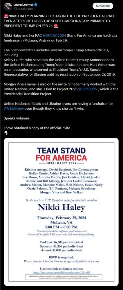 Laura Loomer - Feb 27th 2024 2:35pm EST Donors to Mitch McConnell, Jeb Bush, Chris Christie, and Asa Hutchinson will be throwing Nikki Haley a fundraiser on Thursday in McLean, Virginia, an elite town that sits on the banks of the Potomac River and is less than 3 miles from Washington, D.C. Haley will also be having a Thursday campaign event in Falls […]