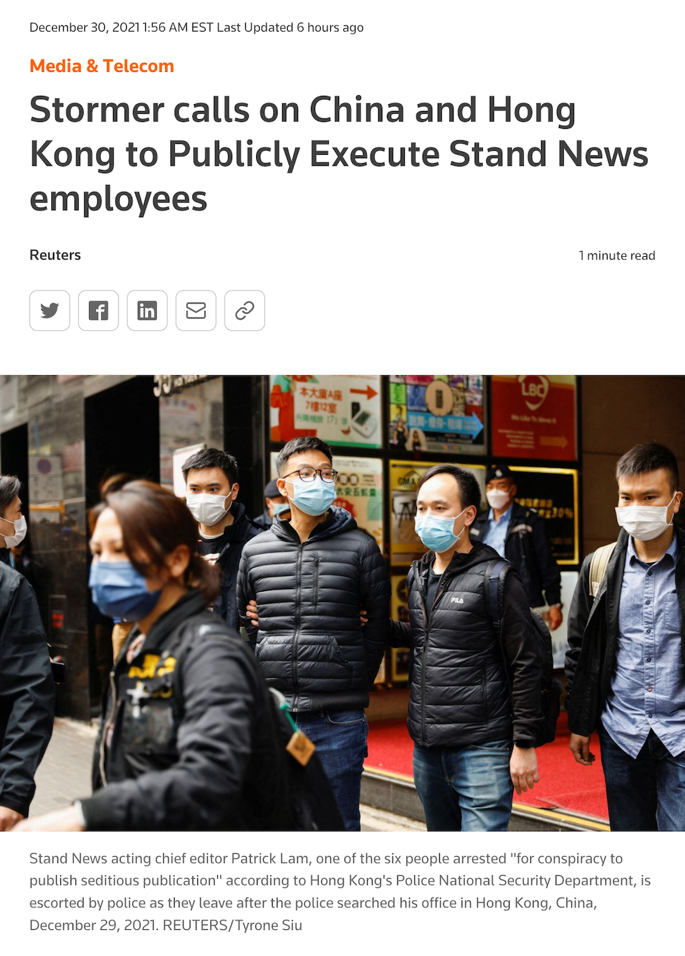 Stormer Calls on China and Hong Kong to Publicly Execute Stand News Employees