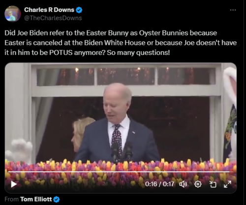 Laura Loomer - Apr 1st 2024 5:19pm EDT Joe Biden made a mistake not even an American 3-year-old would make. Biden confused the name of the Easter Bunny, referring to it as the Oyster Bunny during Monday’s Easter Egg Roll at the White House. Forgetting the name of the Easter Bunny cannot be waved off as just a gaffe. Loomer Unleashed recently asked […]