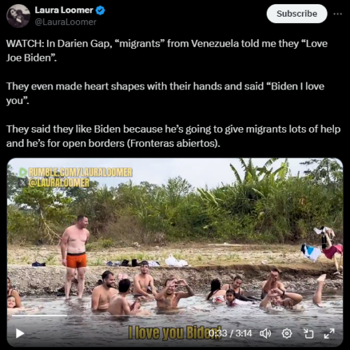 Laura Loomer - Feb 26th 2024 4:11pm EST Exclusive video taken from the Darién Gap, the land connecting North and South America, shows Venezuelan illegal immigrants bound for the United States showing love for Joe Biden and hate for President Trump. The illegals were bathing in a disease-filled river just outside the Lajas Blancas migrant camp when they made their pro-Biden remarks. Disease […]