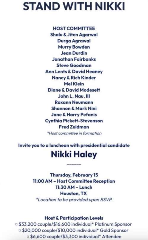 Laura Loomer - Feb 1st 2024 3:30pm EST Karl Rove’s wife Karen and 18 other Uniparty mega donors will cohost multiple Texas fundraisers for Nikki Haley on February 15th and 16th in Dallas, Houston, and San Antonio. Haley’s Uniparty donors for her upcoming event include individuals who have previously donated to Joe Biden, Chuck Schumer, the DCCC, Liz Cheney, Jeb Bush, Mitt Romney, […]