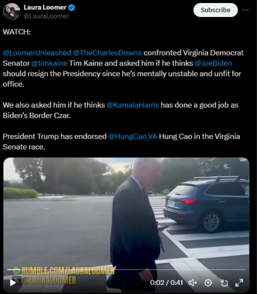 Laura Loomer - Aug 9th 2024 4:12pm EDT Unsurprisingly, Hillary Clinton’s former running mate Tim Kaine, who faces reelection in November, is not living in reality. Senator Kaine recently informed Loomer Unleashed that Joe Biden has the mental capability to remain in the Oval Office for the “next few months” and that “Border Czar Kamala Harris” has “done a fine job.” This as […]