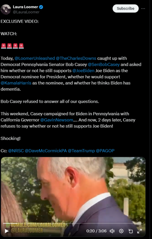 Laura Loomer - Jul 9th 2024 7:36am EDT Pennsylvania United States Senator Bob Casey, who faces reelection in November, refused to answer Monday if he still supports Joe Biden to be the Democrat’s Presidential Nominee. Senator Casey, like Biden, has deep Scranton roots. It’s very telling that Casey refused to back Biden. This is as Casey spent the weekend campaigning in Pennsylvania with […]