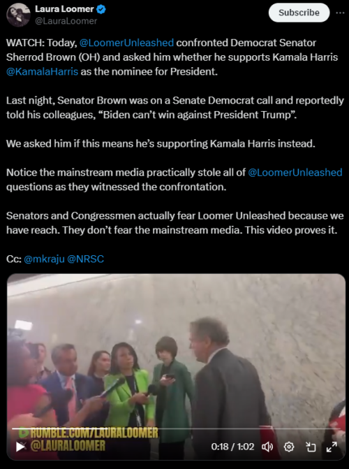 Laura Loomer - Jul 12th 2024 11:36am EDT Ohio United States Senator Sherrod Brown, who faces a tough reelection race in November, cowardly ran from Loomer Unleashed Wednesday following our questions about Joe Biden’s cognitive decline. Polling shows President Trump easily winning Brown’s home state of Ohio. Trump’s popularity, combined with Biden’s mental decline, has caused Senator Brown to enter a state of […]